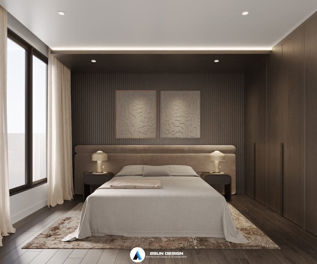 A spacious and inviting atmosphere with neutral tones, layered textures, and a balance between modern furniture and soft lighting. - Master Bedroom & Guest Bedrooms: